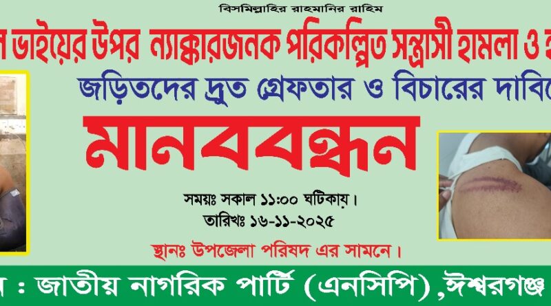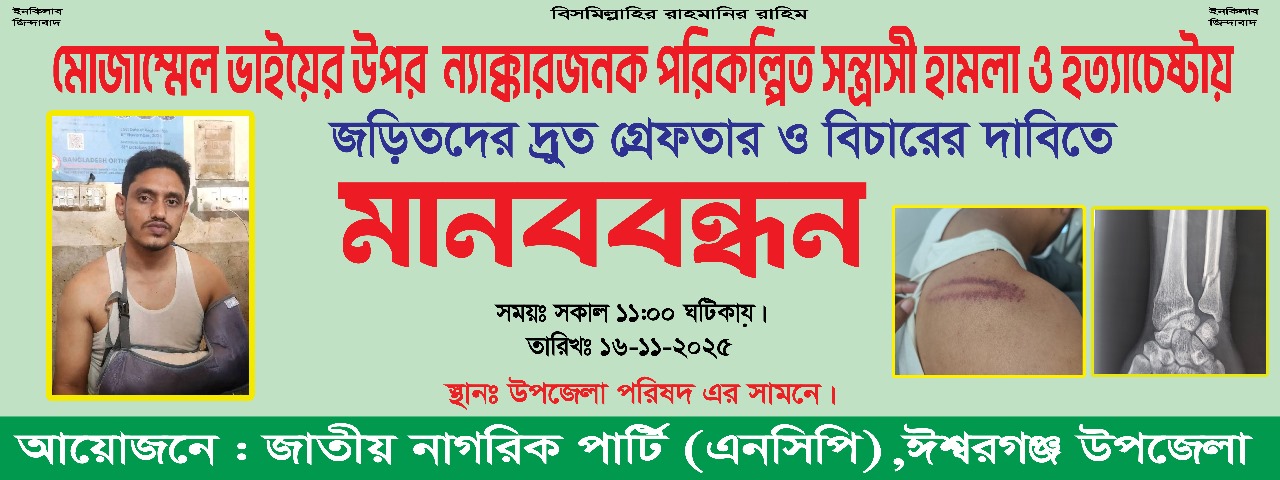 এরি পরিপ্রেক্ষিতে আগামী ১৬ নভেম্বর সকাল ১১ ঘটিকায় ঈশ্বরগঞ্জ উপজেলা পরিষদের সামনে এক বিশাল মানব বন্ধনের ডাক দিয়েছেন NCP এর ঈশ্বরগঞ্জ শাখার সকল নেতা কর্মী সহ সর্ব সমাধারন।এই মানব বন্ধনের মুল চাওয়া হলো পরিকল্পিত সন্ত্রাসী হামলা কারিদের দ্রুত গ্রেফতার করে আইনের আওতান আনা।